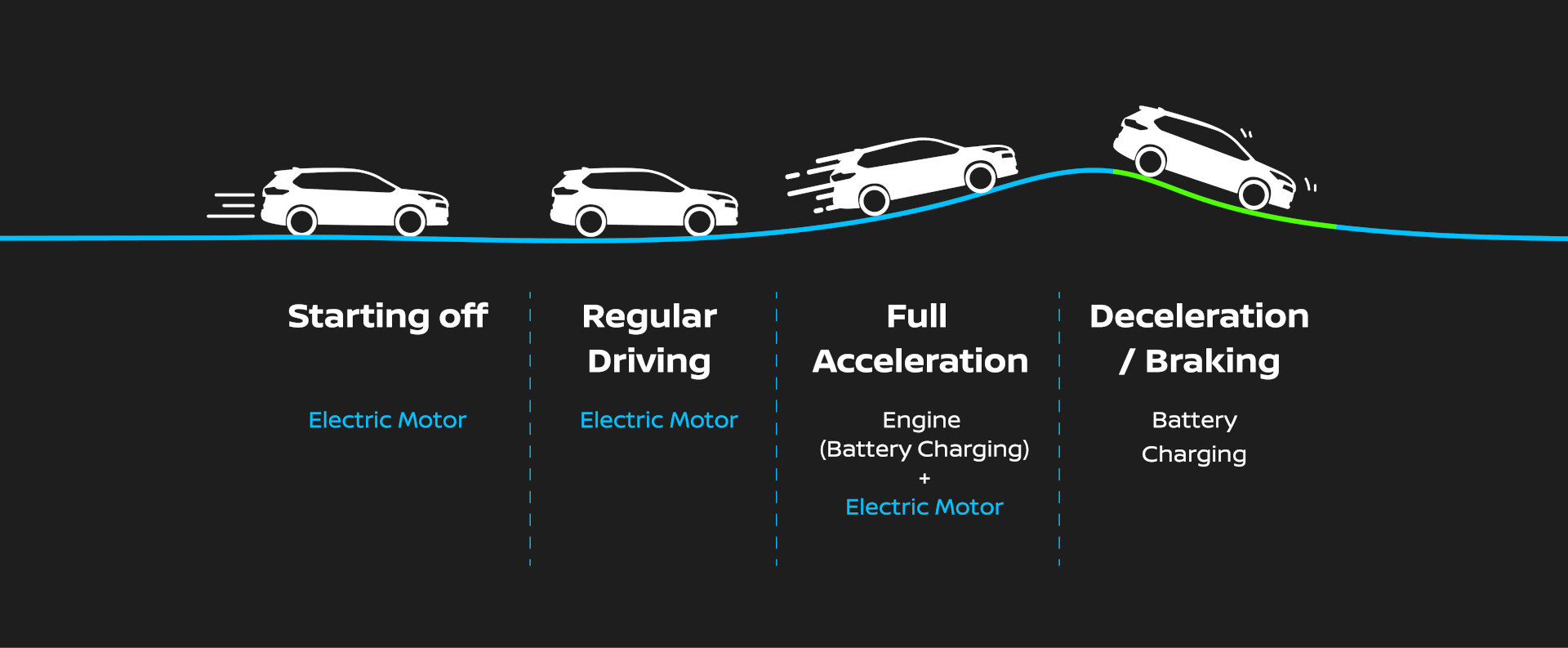e-POWER system includes a gasoline engine with a power generator, inverter, battery and an electric motor. The electric motor delivers power directly to the wheels, using energy stored in the battery pack. Used for charging the battery pack or powering the electric motor, the gasoline engine eliminates the need for an EV charger.