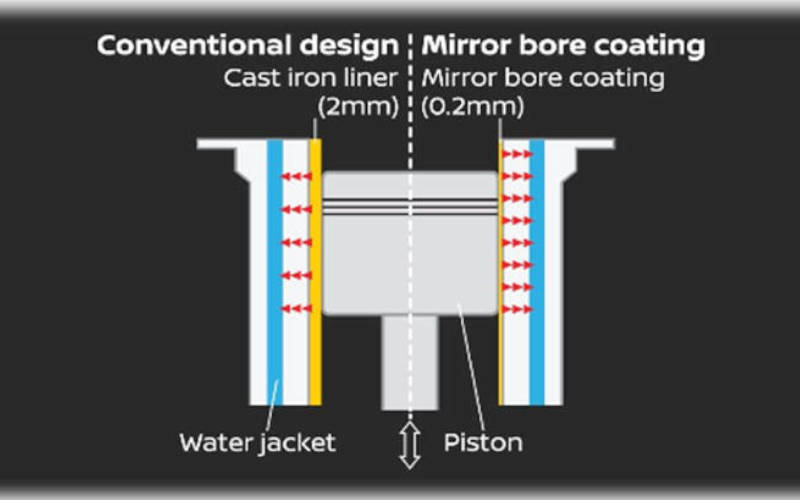 Another important and innovative technology in the all-new 1.0 litre turbo engine is the Mirror Bore Coating Technology that was adapted from the legendary Nissan GT-R. Mirror Bore Coating is a technology that raises energy efficiency by reducing the friction inside the engine. Rather than inserting a cylinder liner, the Mirror Bore Coating Technology sprays a molten iron onto the surface of the cylinder bore and forms an iron coating layer on the walls inside. By giving this a mirror-like finish, the drag that arises when the piston is operating can be reduced.