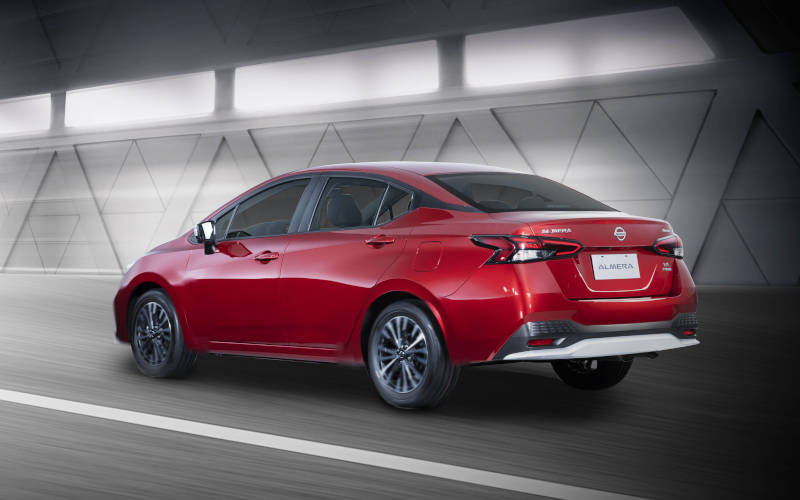 The new sporty design features lower, wider, and longer exterior dimensions using Nissan's Emotional Geometry design language, while retaining the Almera's roomy interior space. Key elements of the Emotional Geometry design language in the new Almera include the V-motion grille, boomerang-shaped headlamps and tail lamps, kick-up C-pillars, and a floating roof.